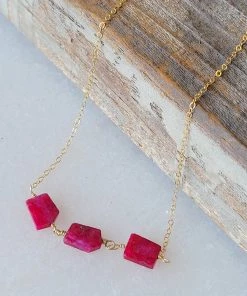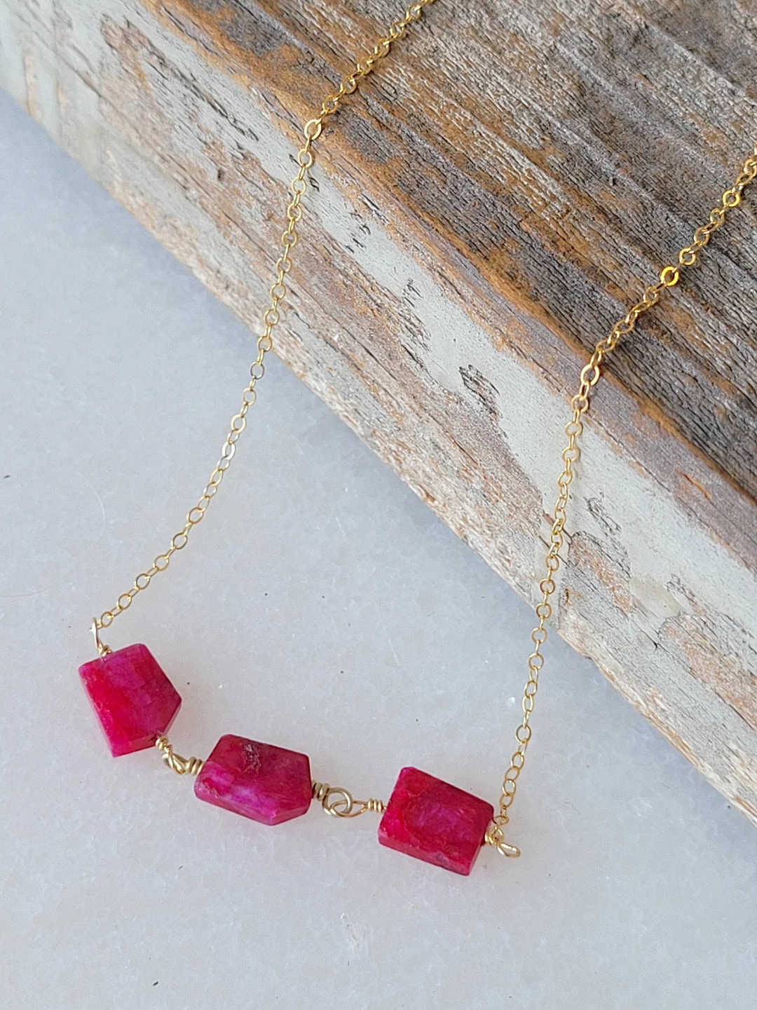 ThreeΒ Ruby stones hand-wrapped onto an elegant 14k gold chain.