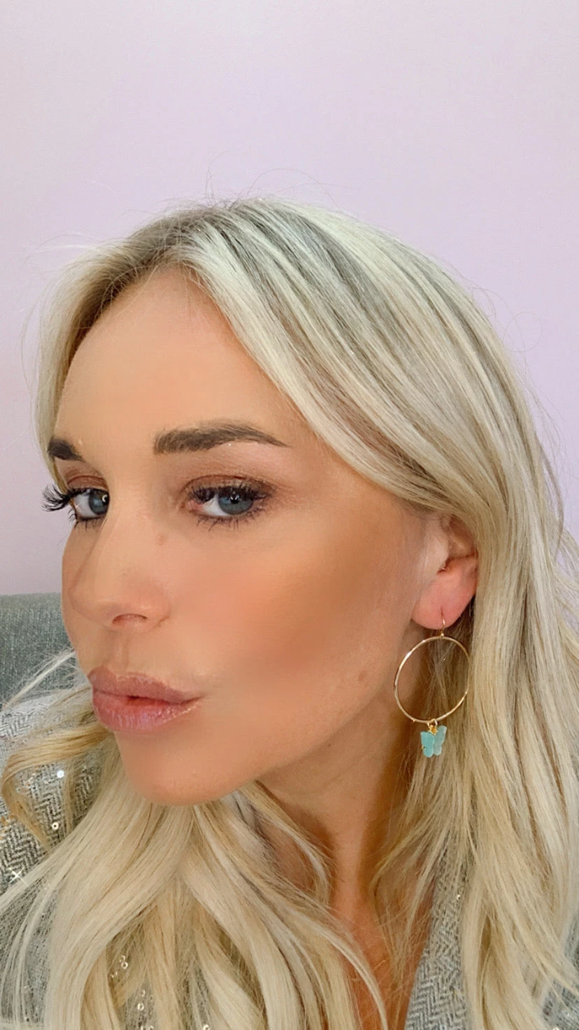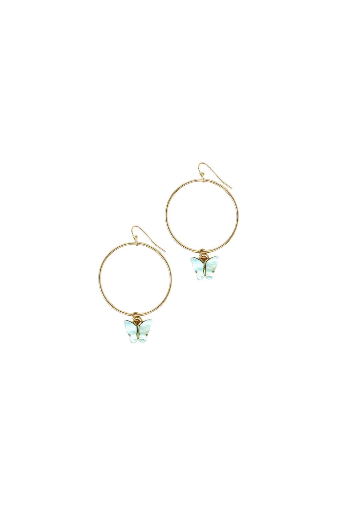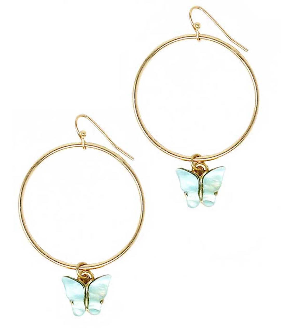 Gold dangle earring with gold hoop and blue butterfly charm drop.