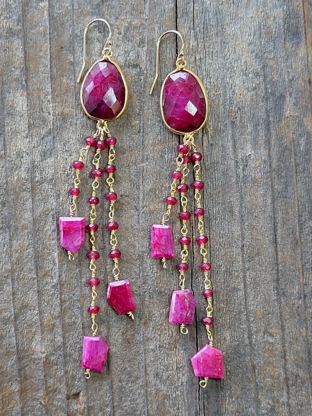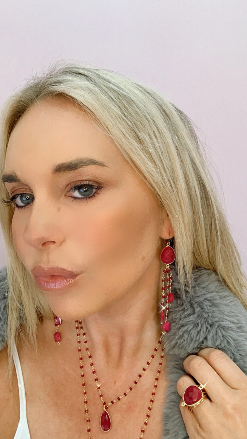 Gold dangle earring with one ruby dropΒ leading intoΒ 3 staggered ruby beaded chain drops.Β