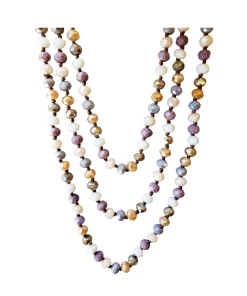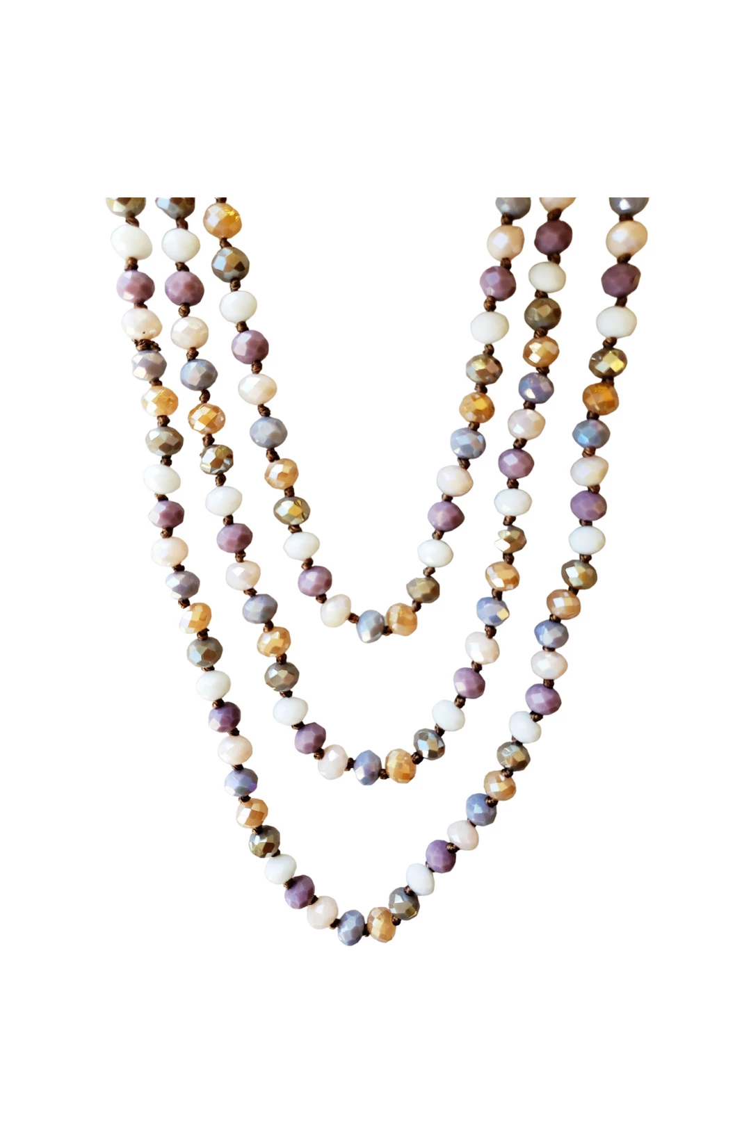Long necklace beaded with champagne, purple and white crystals with decorative knots used to space out each bead.
