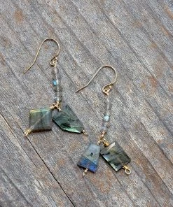 Gold dangle earring withΒ labradorite beads and 2 largeΒ labradorite stone drops.