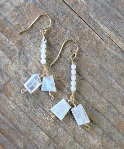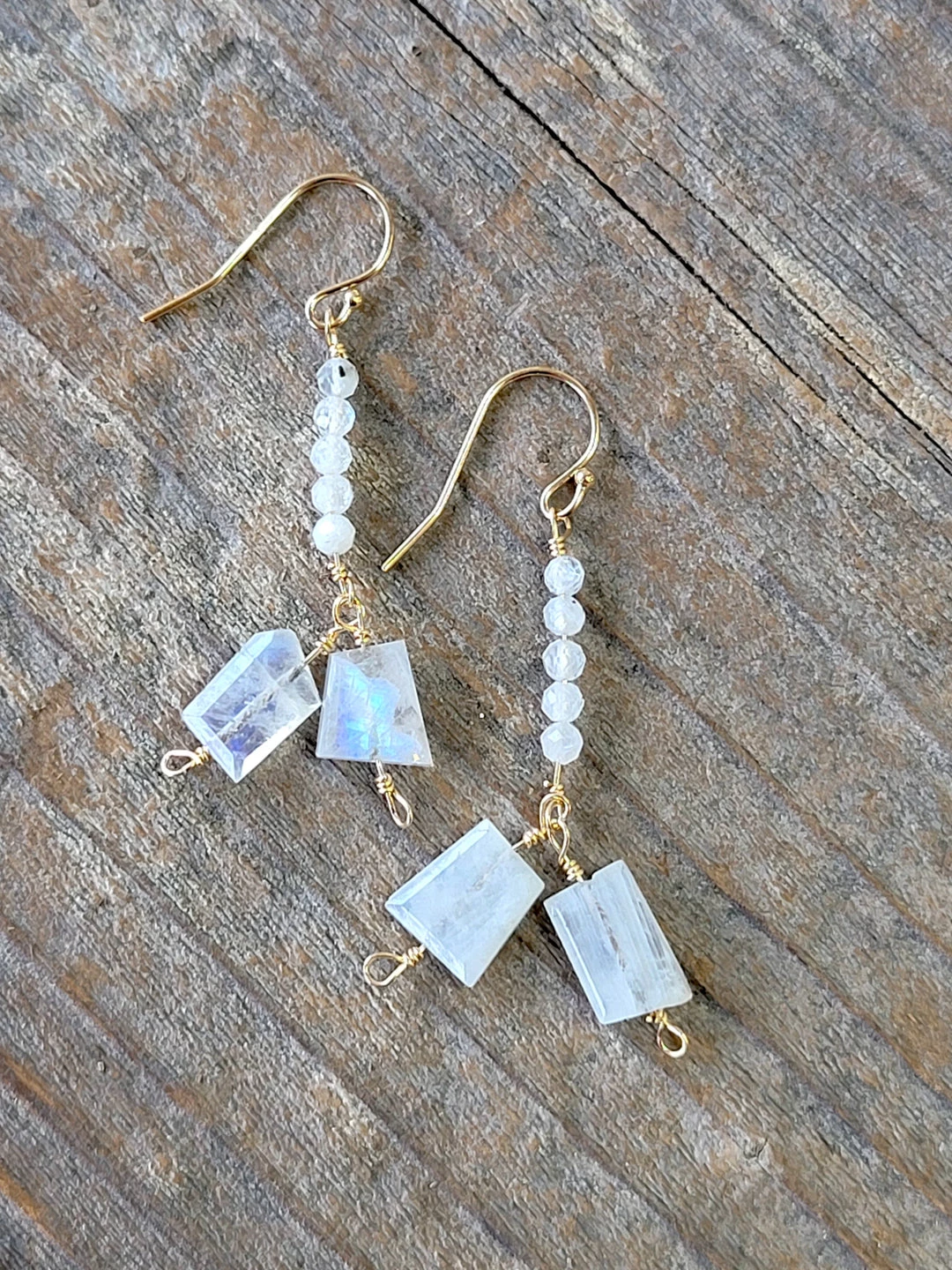 Gold dangle earring with moonstone beads and 2 large moonstone drops.Β