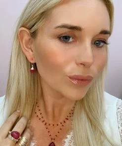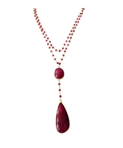 A 16″ gold and semi-preciousΒ ruby beaded chain necklace with a second 17″ gold and semi-preciousΒ ruby beaded chain necklace with a round semi-preciousΒ rubyΒ stone set in a 14k gold vermeil bezel, cascading down to a teardrop-shaped semi-preciousΒ rubyΒ stone pendant set in an 14k gold vermeil bezel.Β