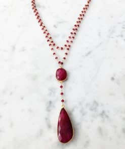 A 16″ gold and semi-preciousΒ ruby beaded chain necklace with a second 17″ gold and semi-preciousΒ ruby beaded chain necklace with a round semi-preciousΒ rubyΒ stone set in a 14k gold vermeil bezel, cascading down to a teardrop-shaped semi-preciousΒ rubyΒ stone pendant set in an 14k gold vermeil bezel.Β