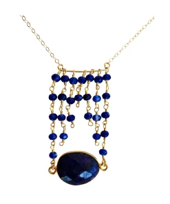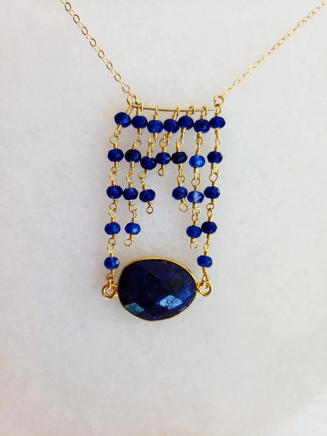 A sapphireΒ stone is set in a 14k gold bezel dangling from sapphireΒ beaded chain to form a pendant, all hanging on a 14k gold chain with a 14k gold spring clasp.