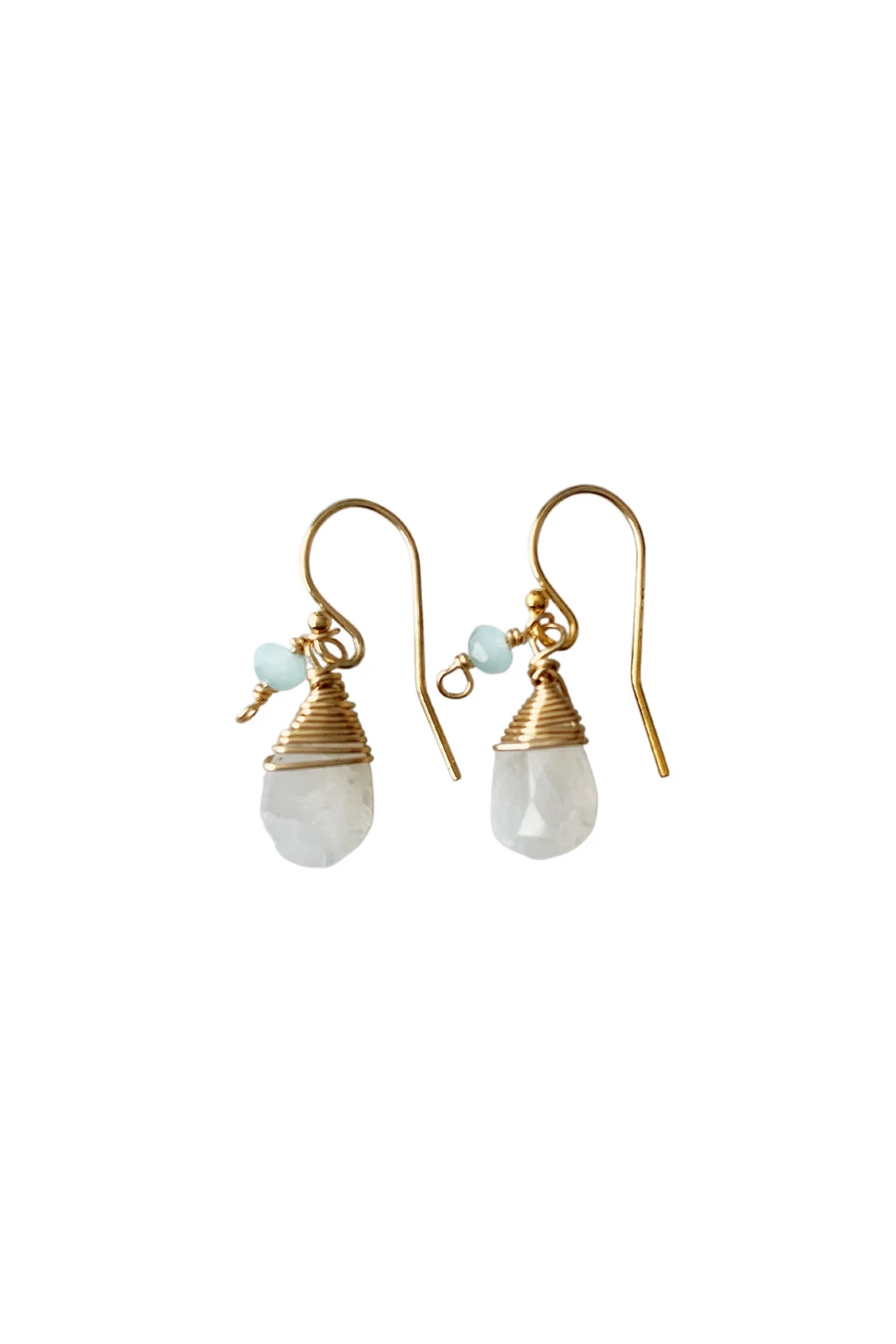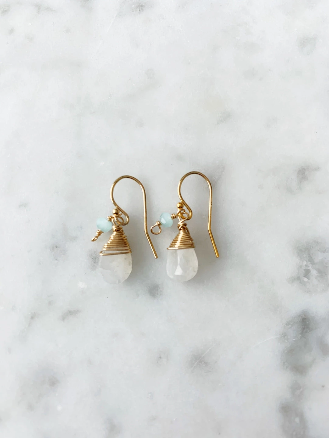 Dangle earring with rainbow moonstone drop hand-wrapped in your choice of either 14k gold fill or sterling silver with a chalcedony drop.