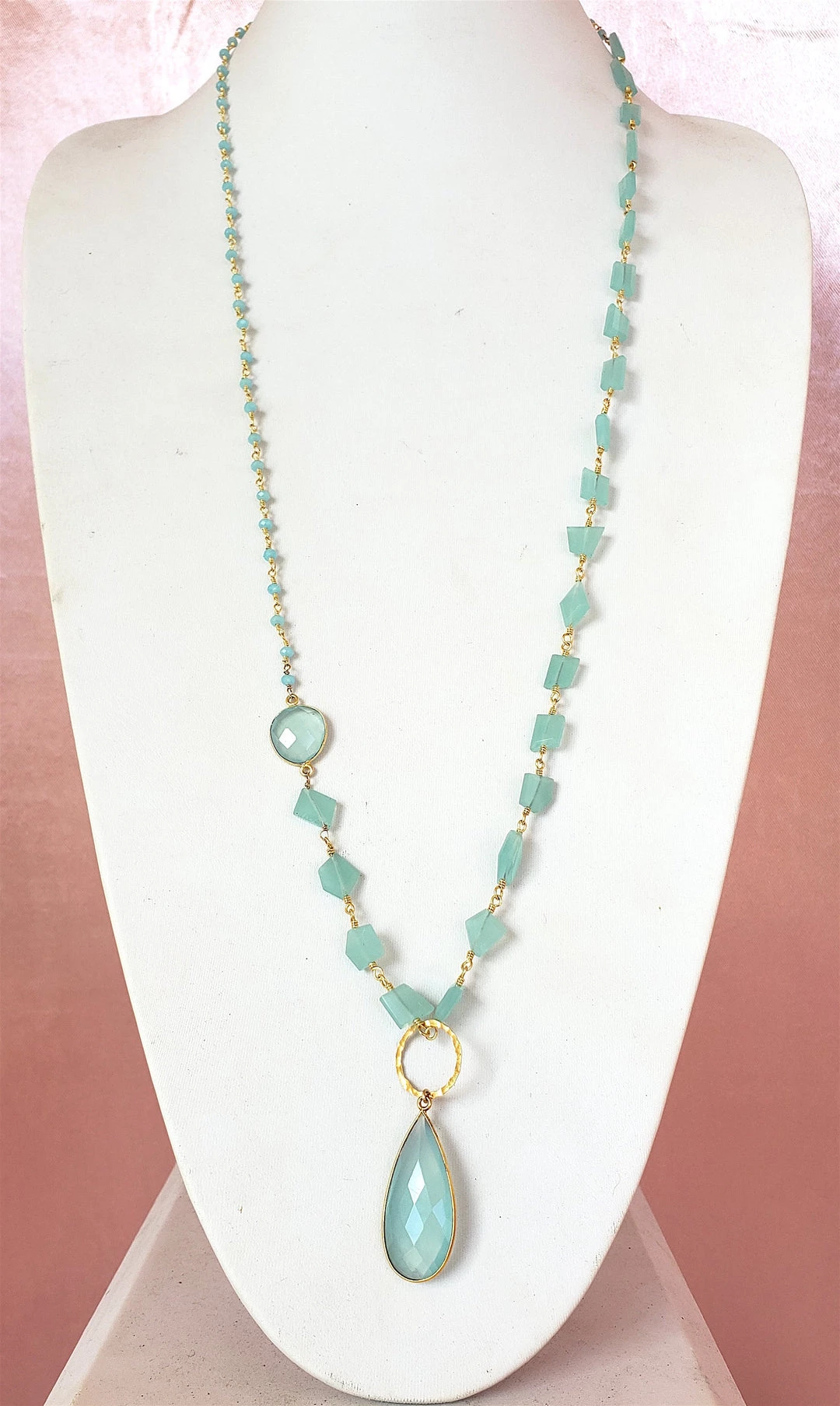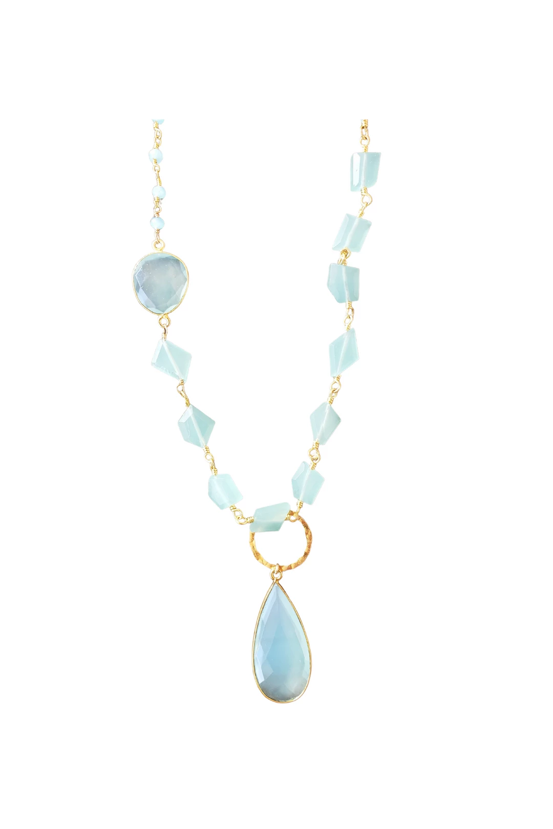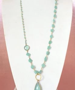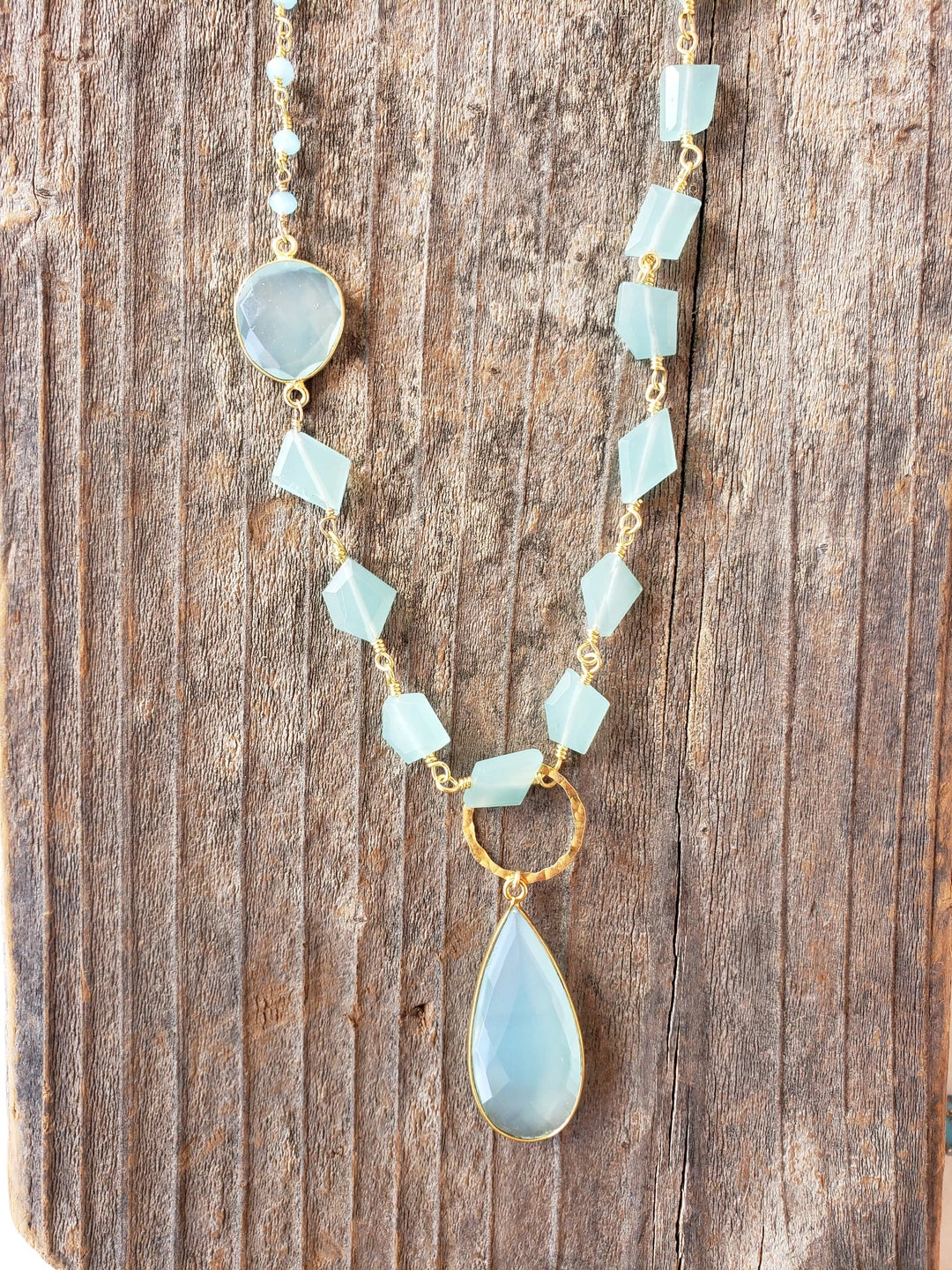 A versatile long style necklace made with chalcedony. This necklace can be layered, worn as a lariat, or adjusted to have either the chunky chain or simple chain as the detail of your center piece.