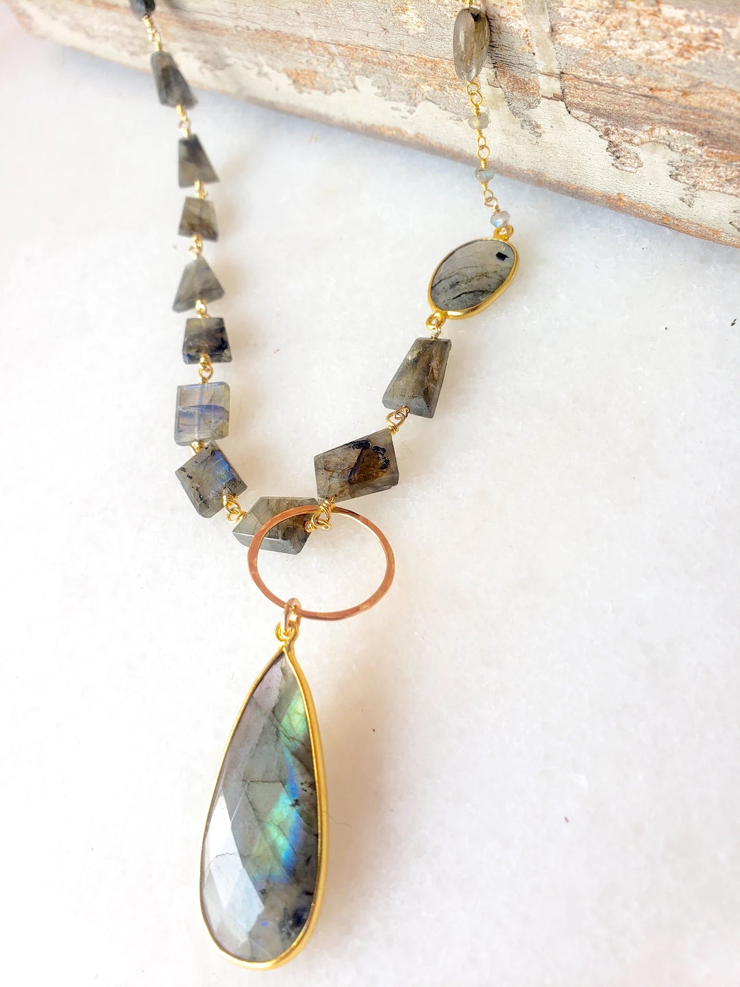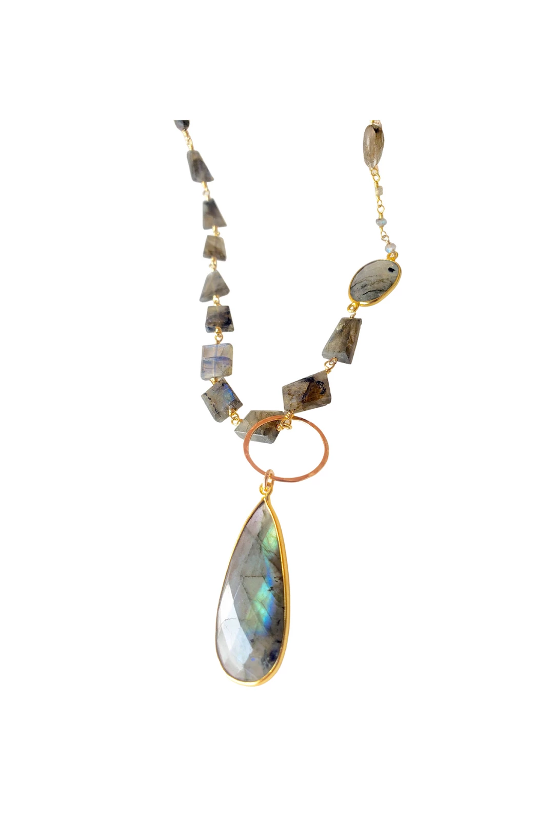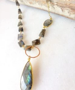 A versatile long style necklace made with labradorite. This necklace can be layered, worn as a lariat, or adjusted to have either the chunky chain or simple chain as the detail of your center piece.