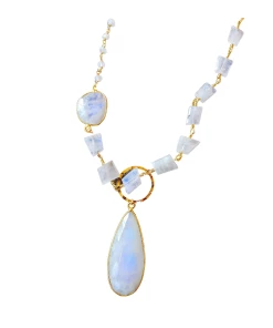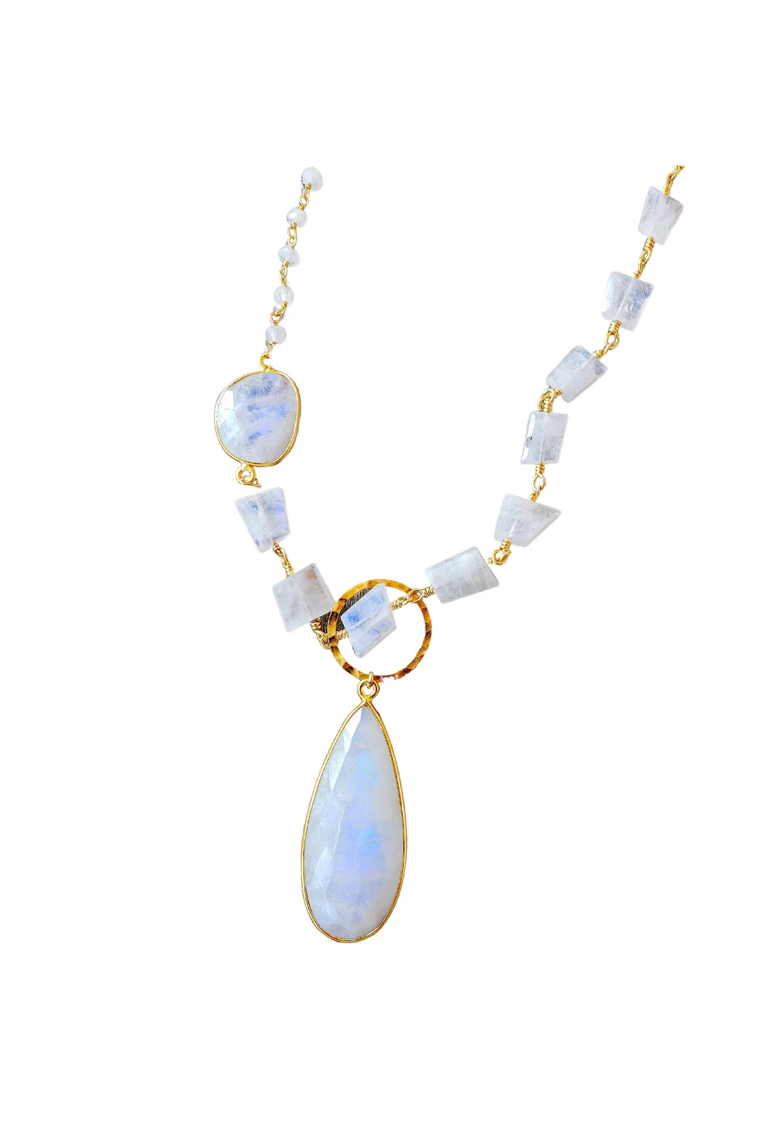 A versatile long style necklace made with moonstone. This necklace can be layered, worn as a lariat, or adjusted to have either the chunky chain or simple chain as the detail of your center piece.