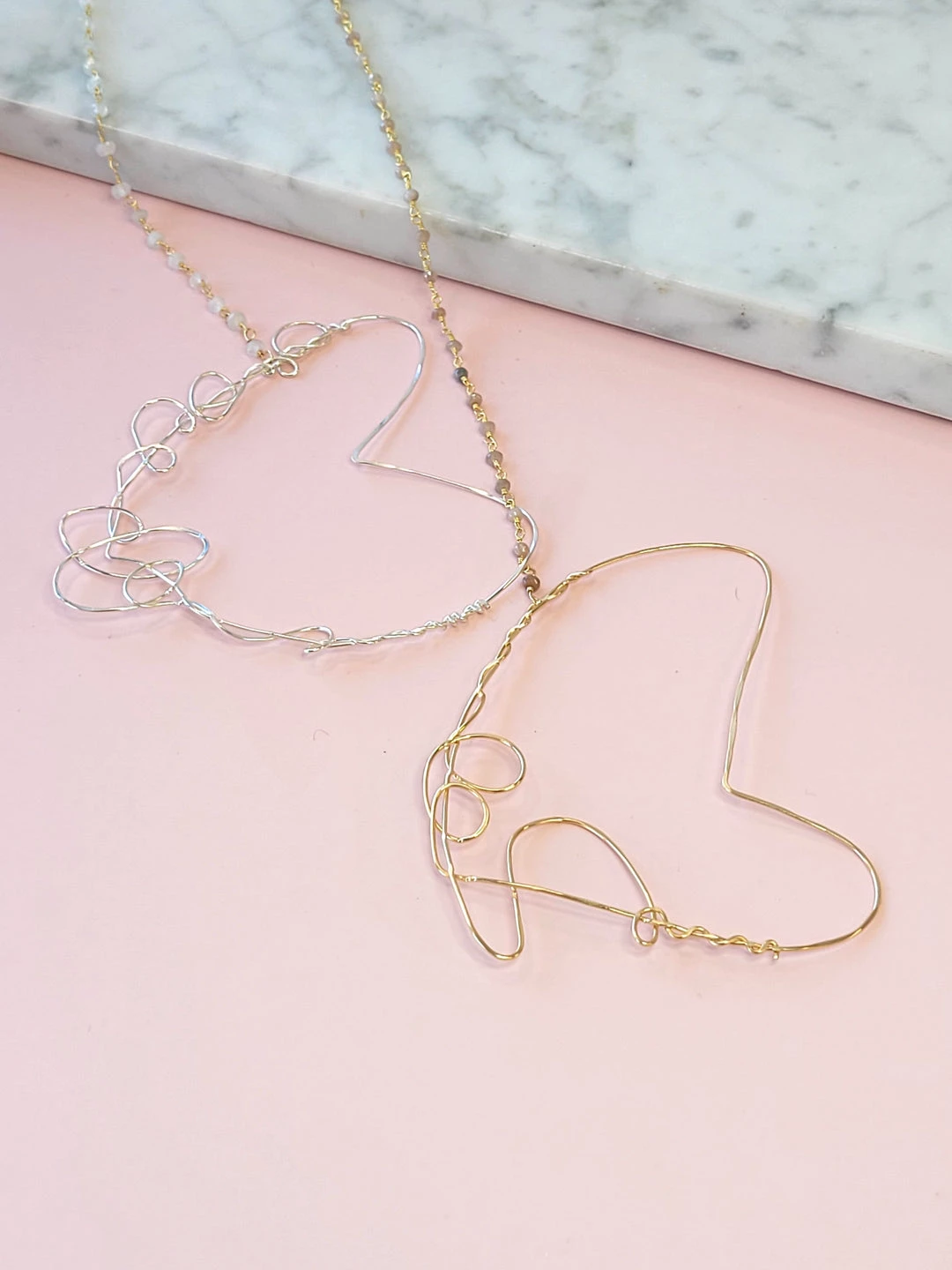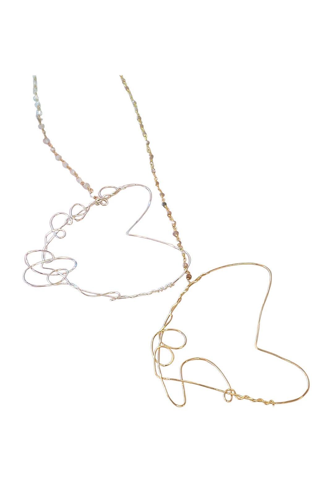Lariat necklace with moonstone and peach moonstone beaded chain with two hand woven hearts, hammered.ย One heart of silver over copper, and the other of gold over copper. To be worn as a lariat, simply thread the hearts though each other and wear at any desired length.