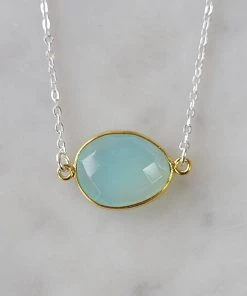 A semi-precious chalcedonyΒ stone set in a 14k gold fill bezel sitting on a goldΒ or silver colored brass chain.