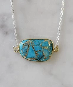 A semi-precious copper turquoiseΒ stone set in a 14k gold fill bezel sitting on a goldΒ or silver colored brass chain.