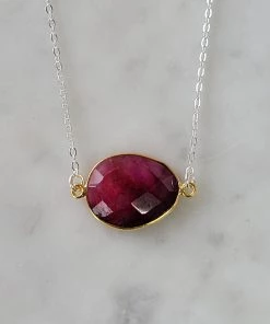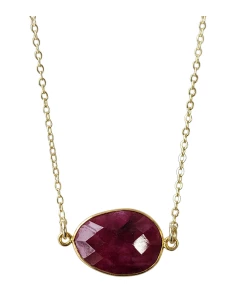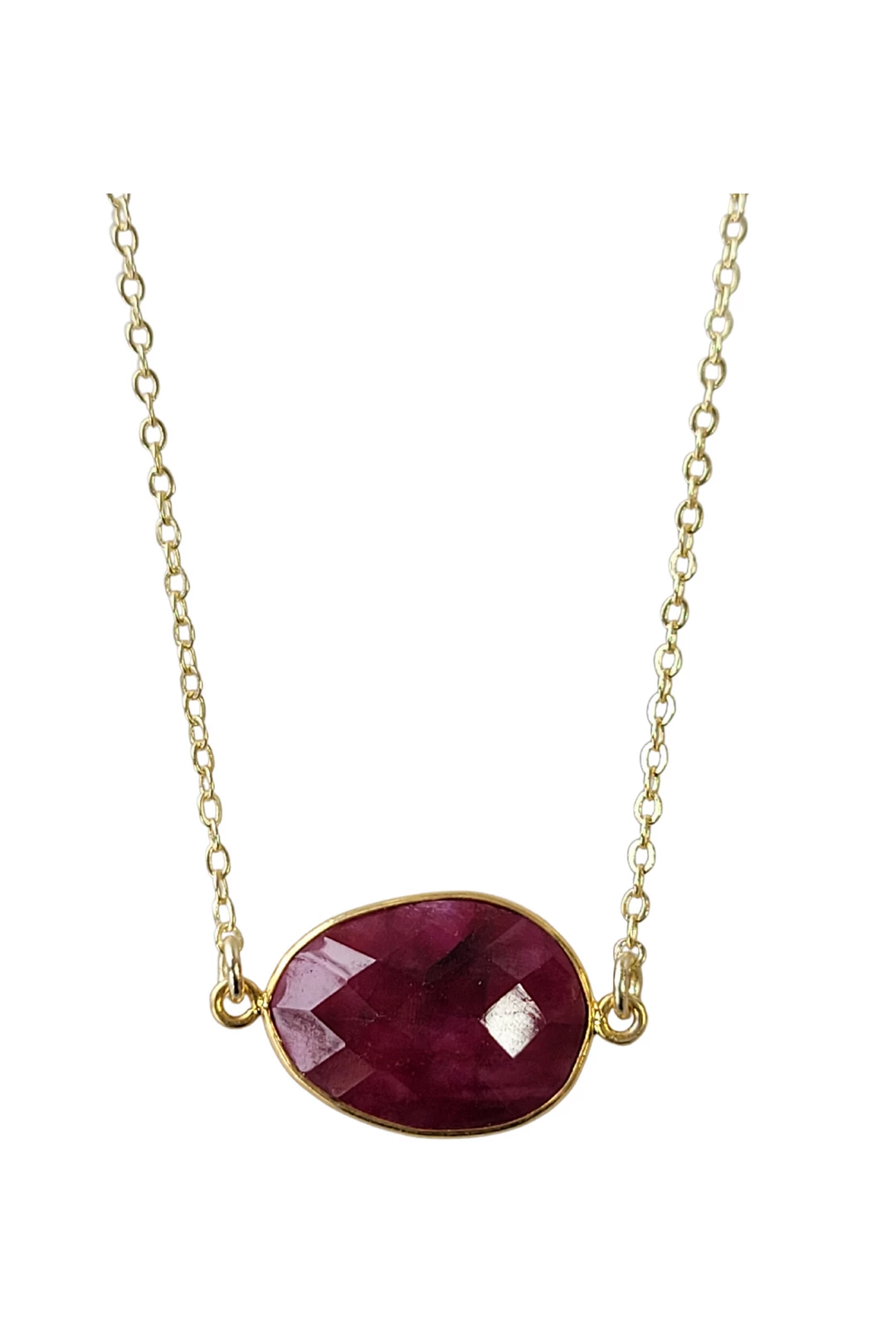 A semi-precious ruby stone set in a 14k gold fill bezel sitting on a goldΒ or silver colored brass chain.