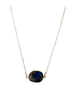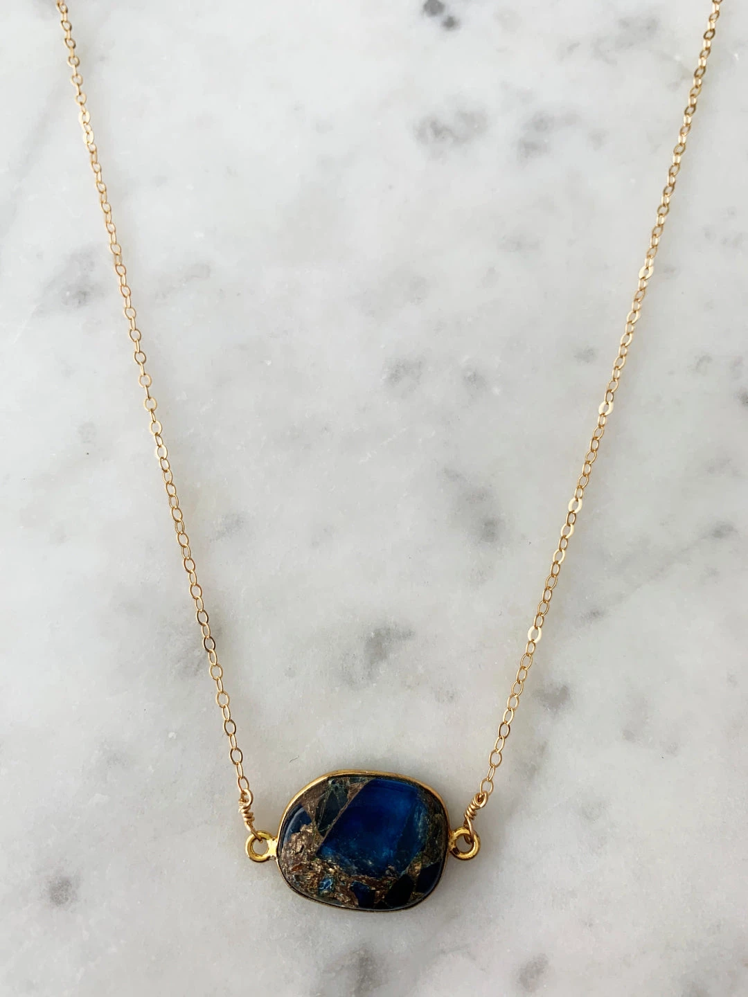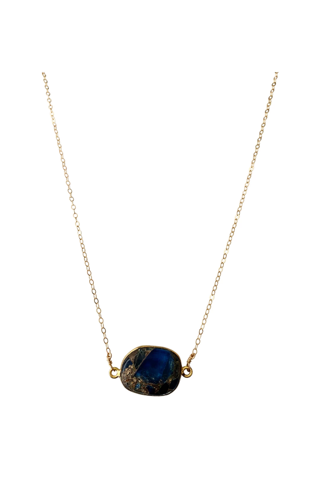 A semi-preciousΒ blueΒ mojave copper turquoise stone set in aΒ 14k goldΒ vermeilΒ bezel sitting on a 14k gold fill chain.
