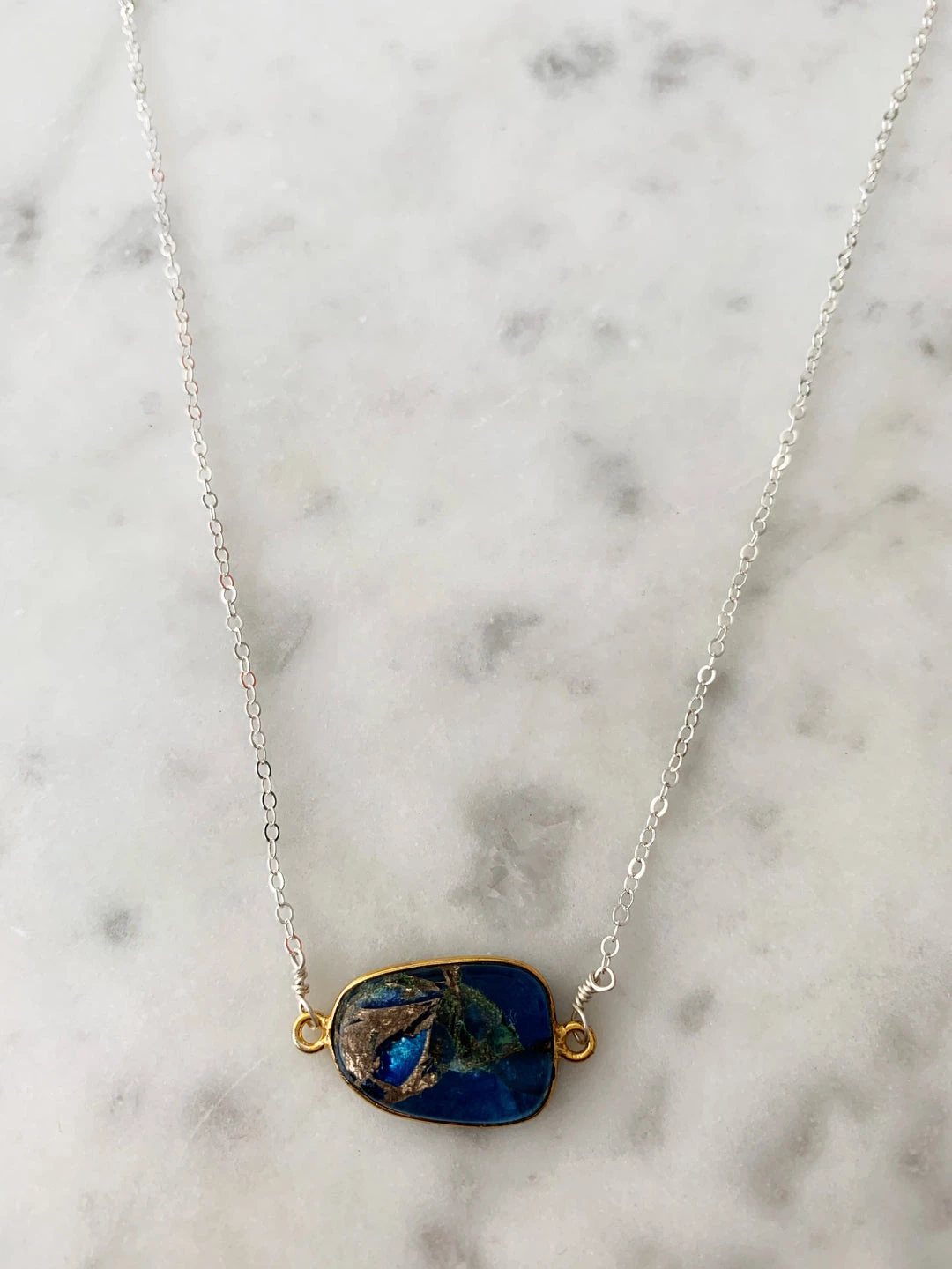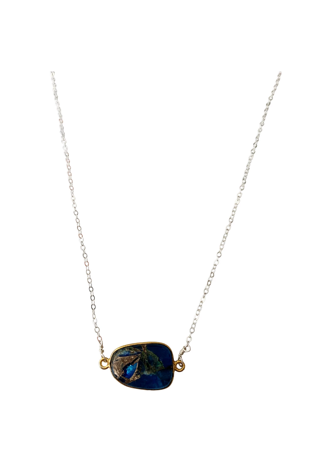 A semi-precious silver blue mojave copper turquoise stoneΒ set in aΒ 14k goldΒ vermeilΒ bezel sitting on a sterling silver chain.