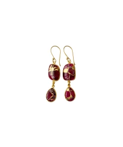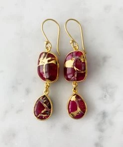 Gold dangle earring with red Mojave copper turquoiseΒ stoneΒ drops. These will vary slightly due to the individual nature of the stones which are semi-precious and unique.