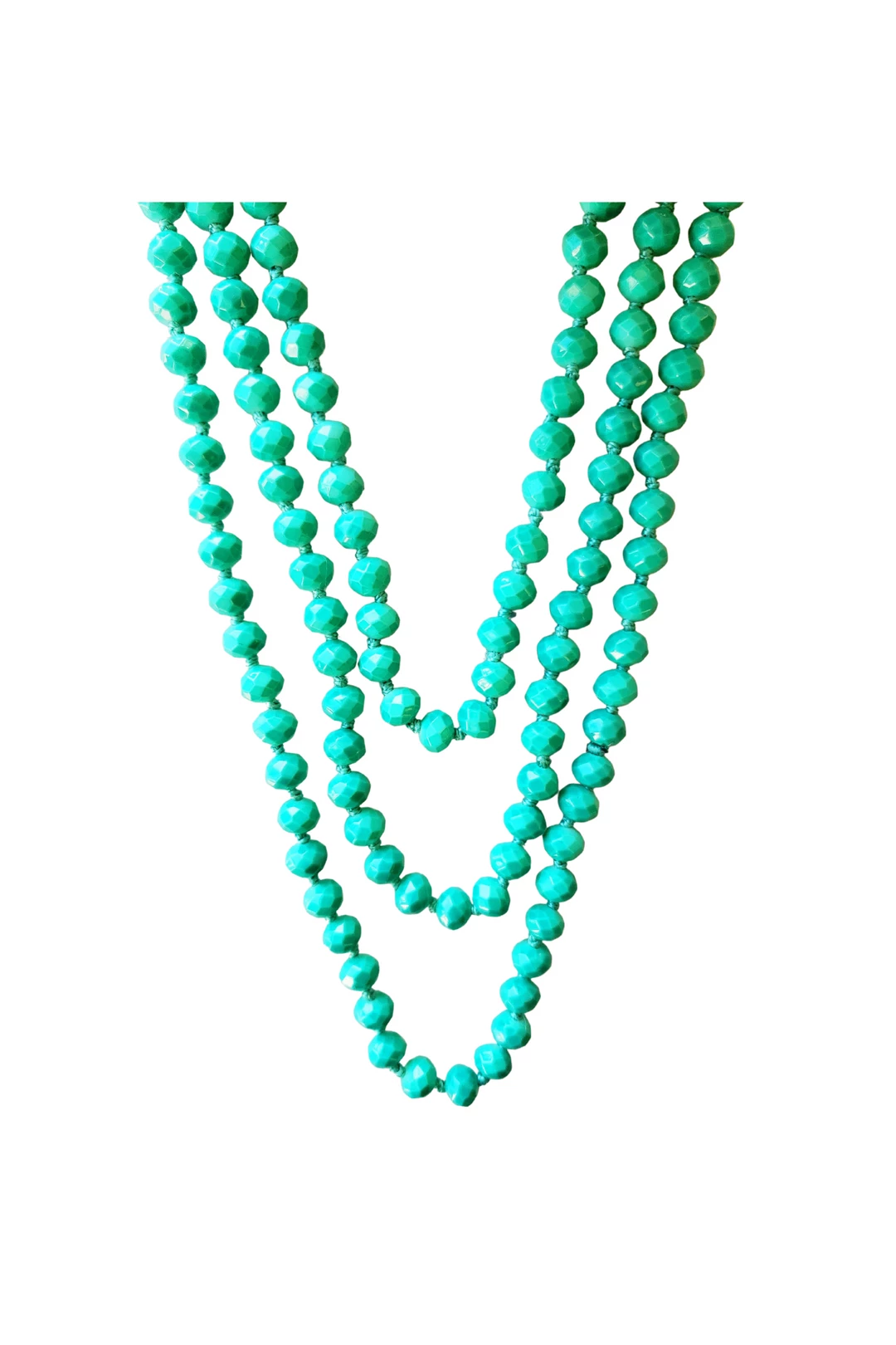 Long necklace beaded with sea green crystals with decorative knots used to space out each bead.