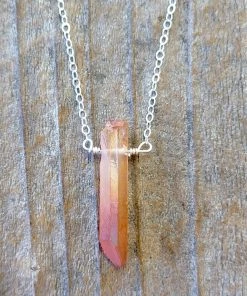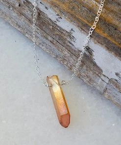 A single raw peachΒ quartz crystal pendant sits on a classic silver chain.