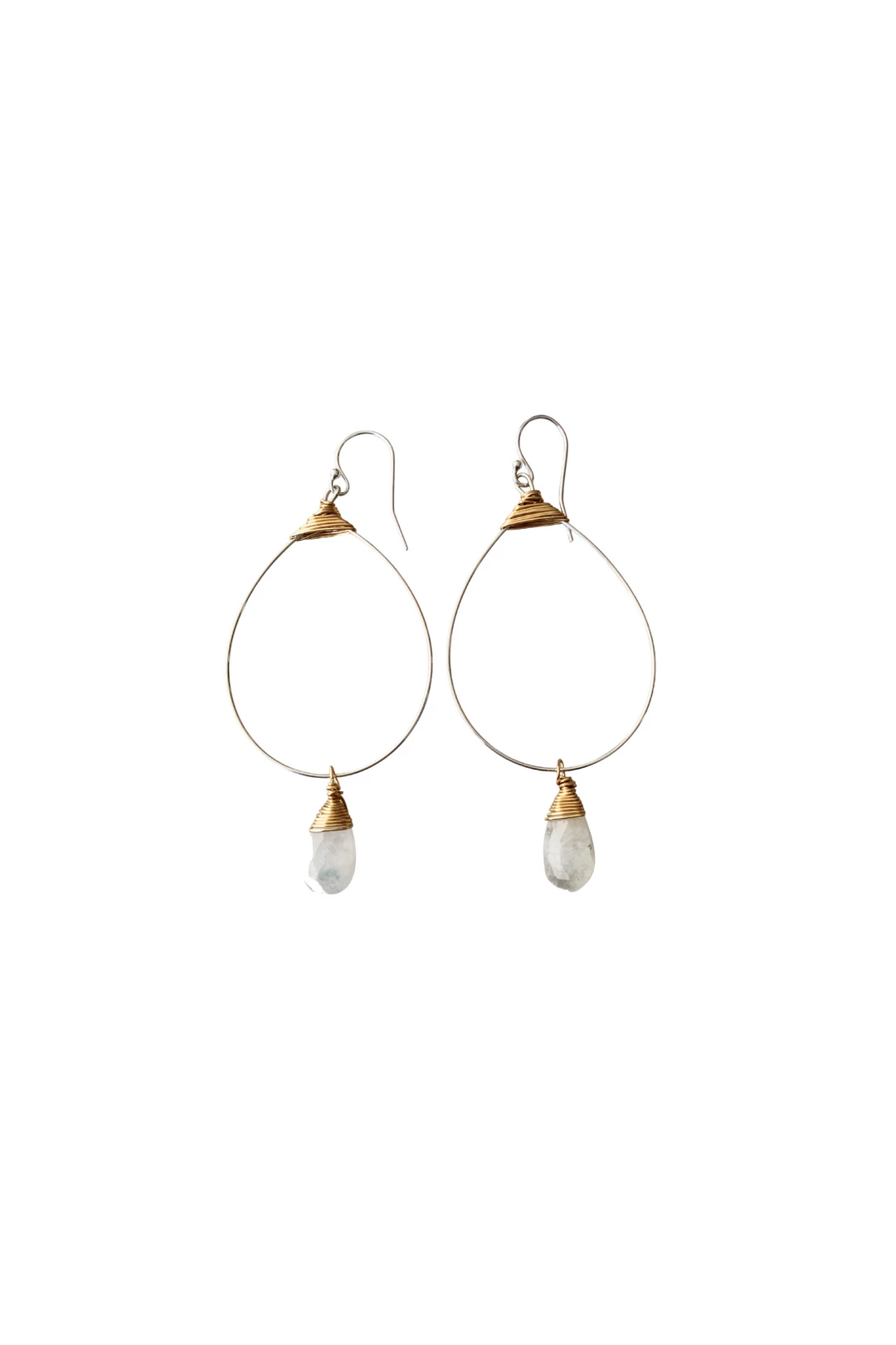 Dangle earring with sterling silver hoop with 14k gold fill wire wrap and a 14k gold fill wire wrapped moonstone drop. These earrings are light as a feather.