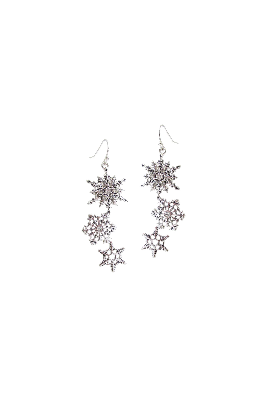 Dangle earring with three silver filigree snowflakes. Perfect for the holiday season.