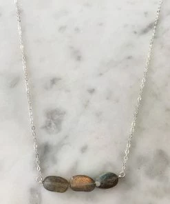 A sterling silver necklace with 3 oval stone labradorite bar pendant.