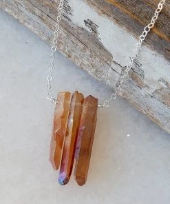 Three RawΒ PeachΒ Quartz Crystal Pendant Necklace in Silver.