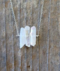 Three Raw Rainbow Quartz Crystal Pendant Necklace in Silver.