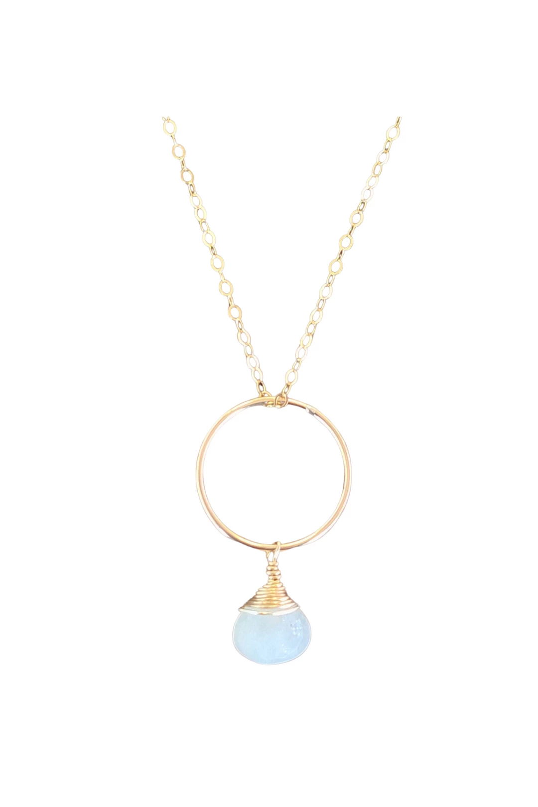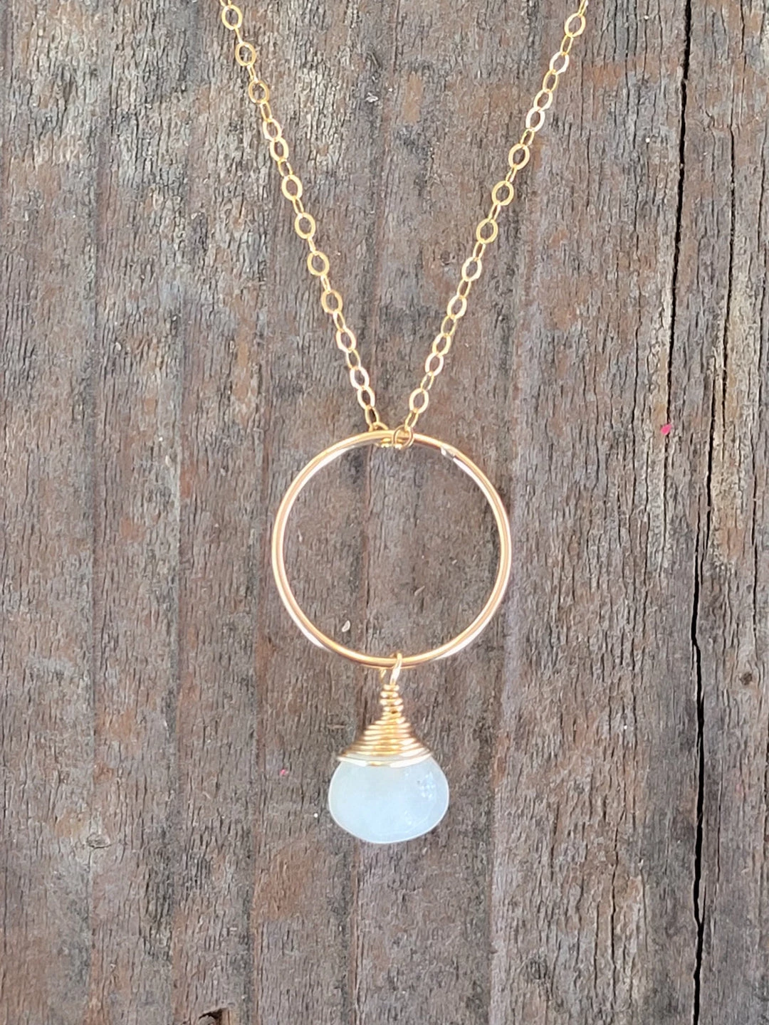 A gold necklace with an elegant gold hoop and a hand-wrapped Moonstone.
