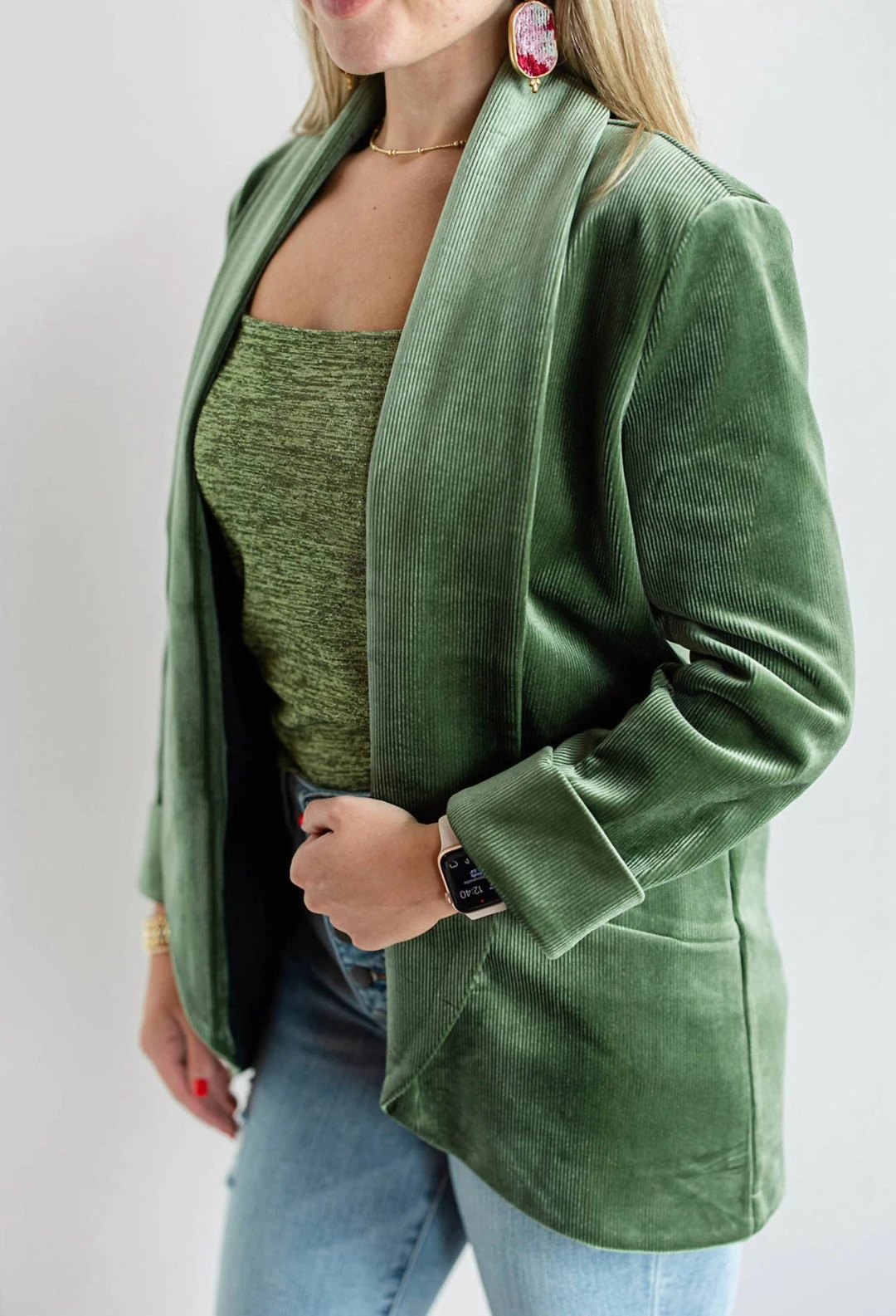 DetailsSize upThis luxurious green velvet cord jacket has fast become our winter best seller. A rich and substantial velvet jacket that comes in boyfriend length with a full-length curved collar.Based on a size SCB length- 73.5cmSleeve length- 52.5cm